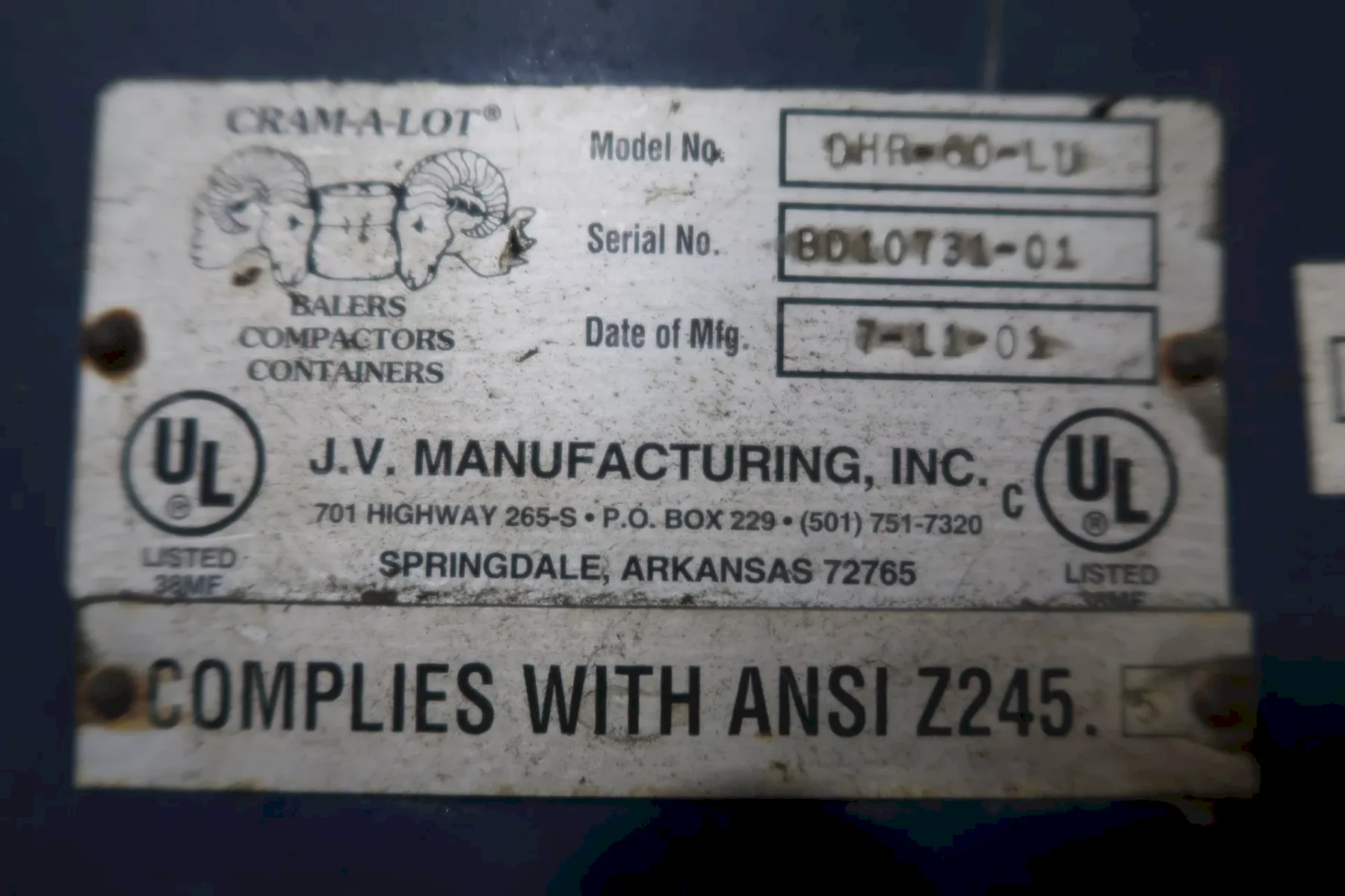 55 GALLON DRUM VESTIL HYDRAULIC CRUSHER & COMPACTOR, MODEL #WBB3147055: YOBRO #24913