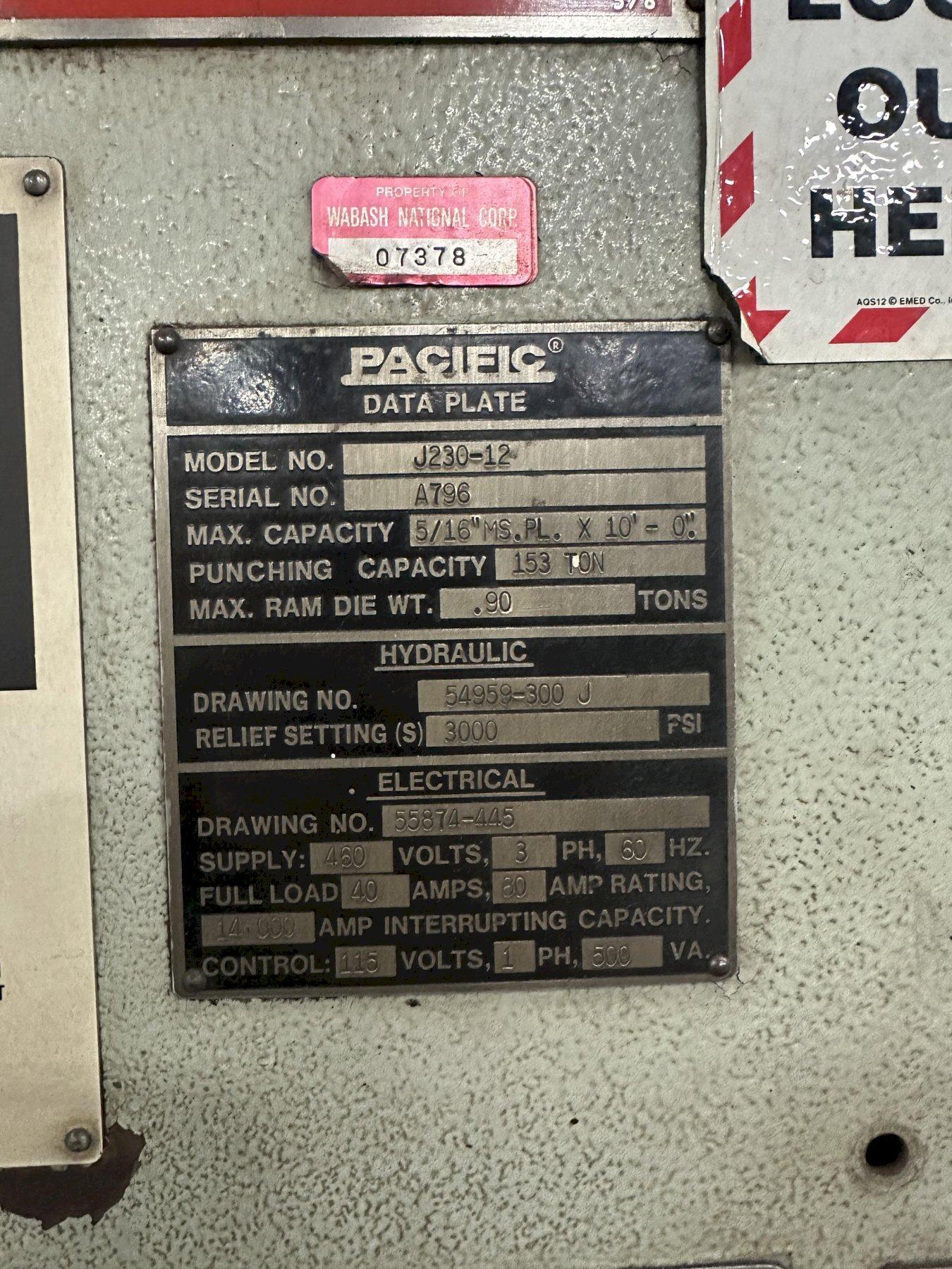 230 TON X 12' PACIFIC MODEL J230-12 HYDRAULIC PRESS BRAKE: STOCK #18531