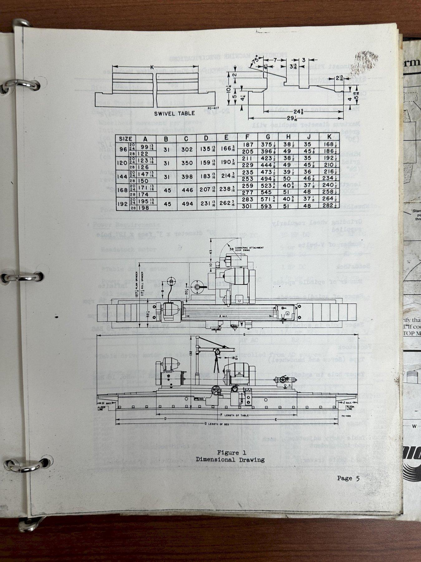 GRINDING WHEEL SIZE ...................... 30" X 4" X 12"GRINDING WHEEL SPEED ..................... VARIABLEWORKHEAD SPEEDS .......................... 25 TO 100 RPMTABLE LONGITUDINAL FEEDS (HYDRAULIC) ..... 3 TO 240 IPMINCREMENTAL INFEED ....................... YES, MANUALFOLLOW RESTS ............................. 3