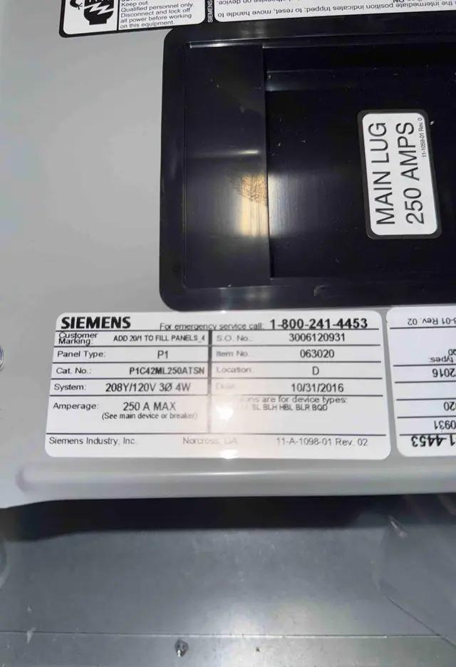 250 AMP SIEMENS CIRCUIT BREAKER PANEL WITH COVER: STOCK #23726