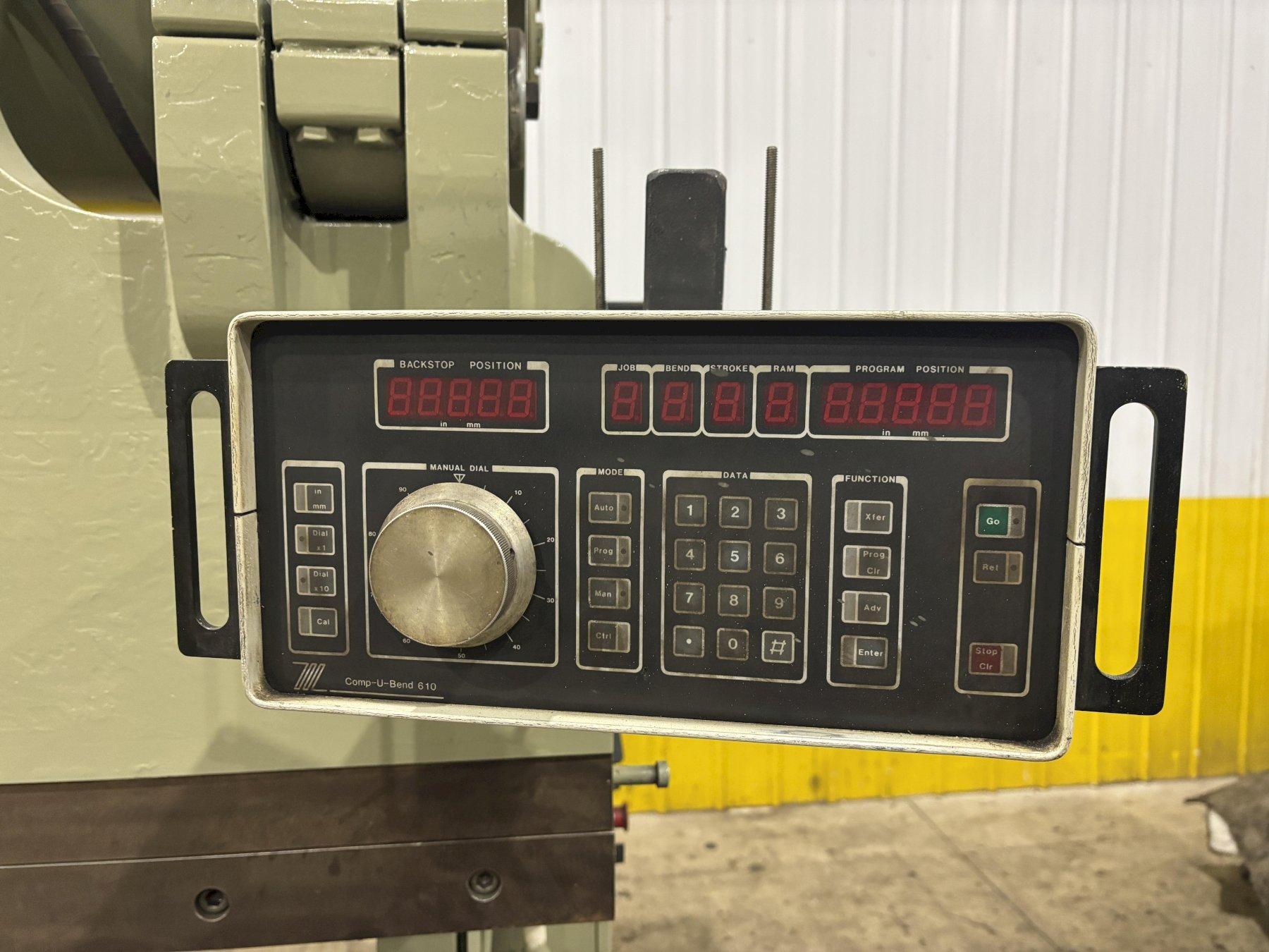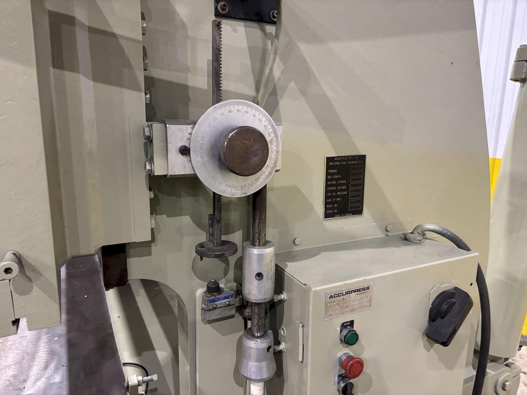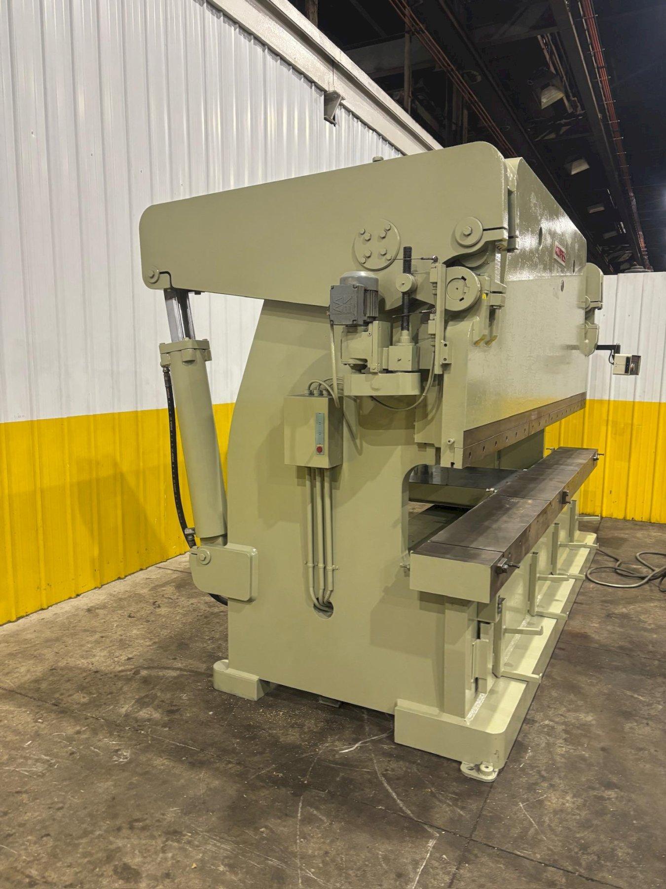 SERIAL .......................... 558MODEL ........................... 725012YEAR NEW ........................ 1984CAPACITY ........................ 250 TONLENGTH OF BED AND RAM ........... 12'DISTANCE BETWEEN HOUSINGS ....... 12'4"BED HEIGHT ...................... 34"STROKE .......................... 8"OPEN HEIGHT ..................... 16"CLOSED HEIGHT ................... 8"STROKES PER MINUTE .............. 13 @ FULL STROKETHROAT .......................... 10"RAM SPEED (FAST APPROACH) ....... 57 IPMRAM SPEED (SLOW BEND) ........... 16 IPMRAM SPEED (FAST RETURN) ......... 130 IPMBACK GAUGE ...................... COMP-U-BENDOPERATOR STATION ................ YES, ELECTRIC FOOT PEDALMOTOR ........................... 20 HP