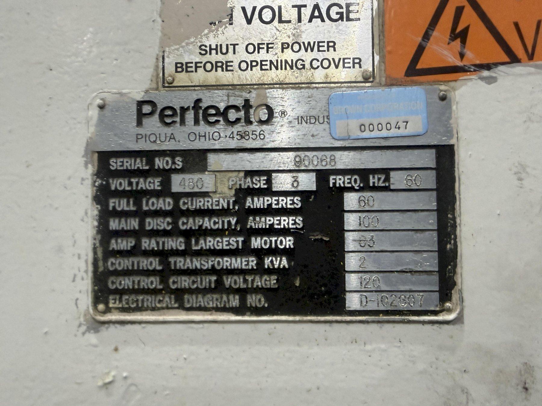 Serial # RS-90064Model: RS30-36B . 28-36-7Description: Perfecto Coil Feed Line 30,000 Lbs. x 36" WideCoil weight capacity:: 30000 poundsStock Width Capacity: 36 inchesMax Stock Thickness Capacity At Full Width: .104 inchesMinimum expansion range:: 20 inchesMaximum expansion range:: 24 inchesCoil O.D. capacity:: 72 inchesStock thickness capacities:Max stock thickness at 36" wide: .104"Max stock thickness at 18" wide: .140"Perfecto Coil Reel Model No. RS30-36BThree leaf mandrelHydraulic mandrel expansionThreading drive for jog forward and reverseAir brake (adjustable tensioning)Traveling coil load carPowered lift and travelPerfecto Powered Coil Straightener Model No. 28-36-7Entry and exit pinch rolls with air operated adjustmentSeven straightening rolls x 2.8" diameterBack up support rollers on upper and lower straightening rollsIndividual upper roll adjustmentsCoil hold down arm with motorized end wheelStock peeler tableAdjustable stock width edge guidesAC VFD drive and control systemOperator's control stationJog forward and reverseAuto / Run cycle - loop controlPerfecto Exit Threading Table