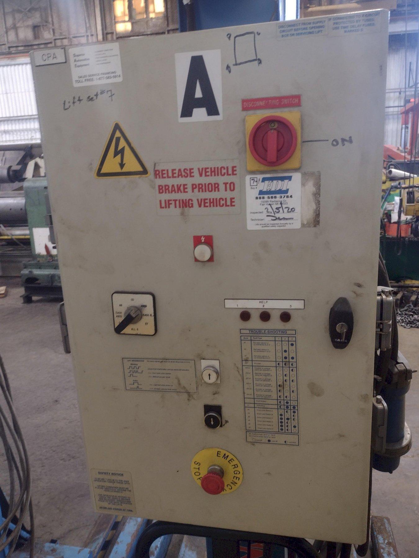 SERIAL ............... 48857YEAR NEW ............. 2006MODEL ................ 1200-M-72LIFTING CAPACITY ..... 16,000 LBS PER COLUMNLIFTING HEIGHT ....... 72" MAXTIRE SIZE ............ 38" TO 45"LIFT MODES ........... SINGLE, GROUP, PAIRCONTROLS ............. PUSH BUTTON & PENDANT