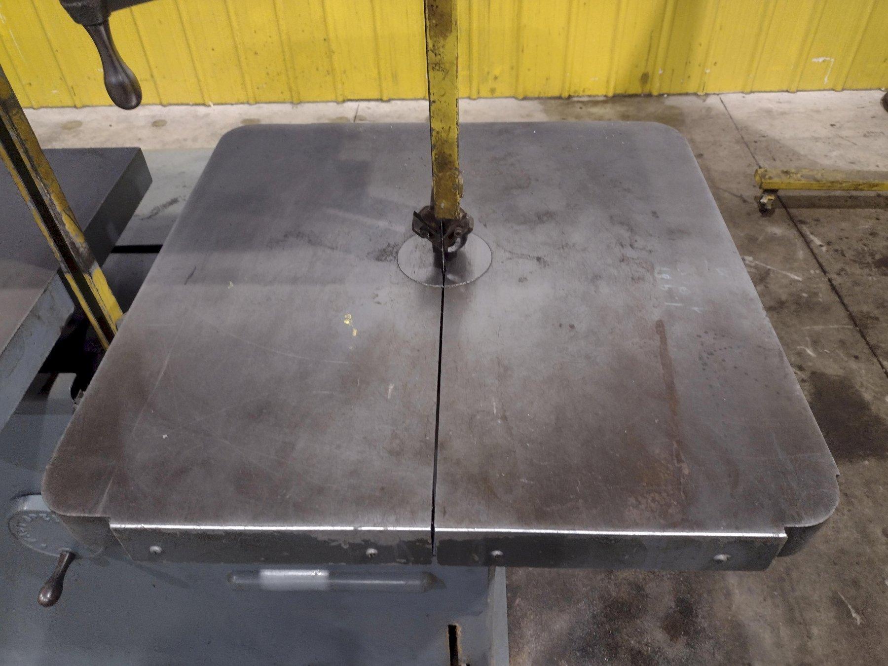 Throat 36 inchesMax Work Height 13 inchesTable Size 26" x 26" (tilts 45° right and 10° left)Blade Speed 50–5,200 fpm (variable)Blade Length 199 inchesBlade Width Capacity 1/16" to 1"Motor 1.5 HPWeight ~1,500 lbsDimensions 71"L x 39"W x 78"HWheel Size 16 inches